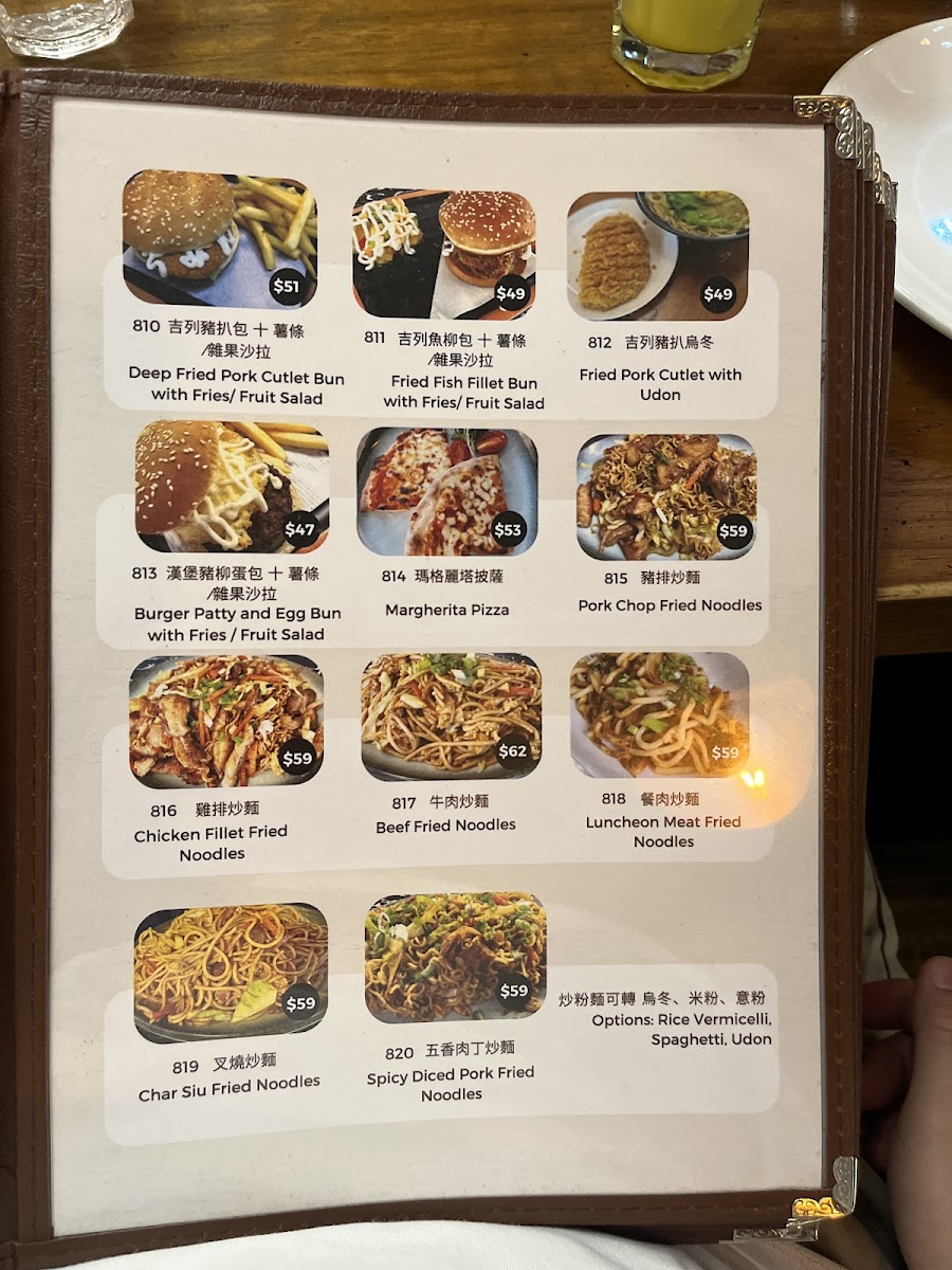 They have delicious Dutch snacks like frikandellen, kroketten (croquettes), bitterballen en kaassouffles. Fries and a snack is 40HKD and you'll get a drink included. For 12 HKD extra you get a an Illy coffee with it. They also have all other kinds of western and Chinese food. Nice place in case you're in the neighborhood.